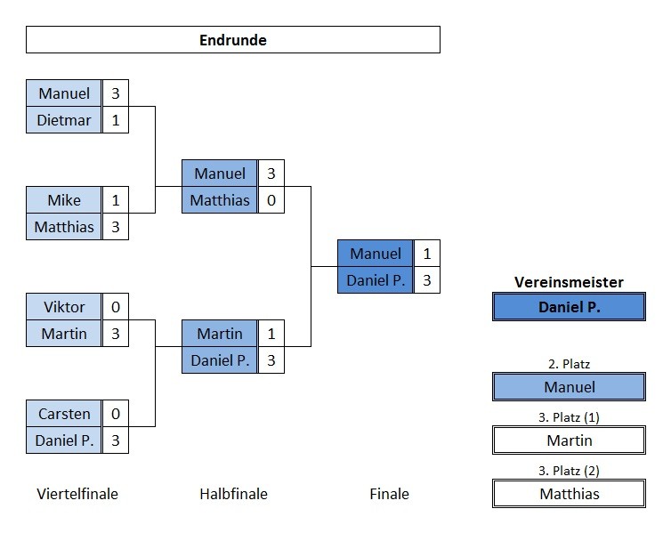| Vereinsmeisterschaften TTV Schmieheim 01.11.2015Favorit Daniel Patzwald zum 20.Mal Am 01. November wurden beim TTV Schmieheim die Vereinsmeisterschaften im Einzel sowie Doppel durchgeführt. Begonnen wurde zuerst mit dem Einzelwettbewerb der Herren, der Aufgrund reger Teilnahme im Zwei-Gruppen Modus ausgetragen werden konnte. In der Gruppenphase gab es dieses Jahr keine großen Überraschungen, so dass sich alle Favoriten für die KO-Runde qualifizieren konnten. Topfavorit Daniel Patzwald - der letztes Jahr bereits im Viertelfinale ausschied -spielte sich gegen Gräßlin und Bischof ohne große Mühe ins Finale. Dort wartete bereits Manuel Stubanus, der sich im Halbfinale klar gegen den letztjährigen Sieger Matthias Patzwald durchsetzen konnte. Stubanus gab gegen Daniel Patzwald im Finale sein Bestes, jedoch musste auch er sich geschlagen geben und so siegte Patzwald mit 3-1 Sätzen. Somit konnte Rekordmeister Patzwald schon seine 20. Vereinsmeisterschaft feiern. Direkt im Anschluss fanden schließlich die Doppelmeisterschaften im „Jeder-gegen- Jeden“ Modus statt. Die Auslosung ergab dieses Mal besonders ausgeglichene Mannschaften. Waren doch bis kurz vor Schluss noch vier Teams gleichauf. Erst die jeweils letzten beiden Spiele brachten die Entscheidung. Sieger wurden die Spieler Viktor Benzel mit Partner Stephan Hurst - lediglich einen Satz besser als die Zweitplatzierten Carsten Gräßlin und Dietmar Wangler. Auf dem dritten Platz folgte Manuel Stubanus mit Carmen Patzwald. EinzelDoppel