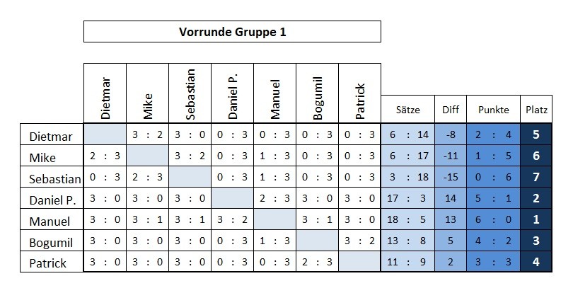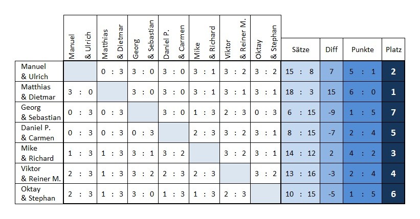 Vergangene Woche wurden beim TTV Schmieheim die Vereinsmeisterschaften im Einzel sowie Doppel durchgeführt. Begonnen wurde zuerst mit dem Einzelwettbewerb der Herren. Aufgrund reger Teilnahme der Vereinsmitglieder in zwei Gruppen aufgeteilt, gab es bereits in der Gruppenphase einige Topspiele und Überraschungen. Altmeister und Topfavorit Daniel Patzwald musste sich dem stark aufspielenden Manuel Stubanus in der Gruppenphase geschlagen geben, kam jedoch als zweitplatzierter in die Hauptrunde wo er sich keine Blöße mehr gab und ins Finale einzog. In der Hauptrunde gab es dann gleich zwei Überraschungen, als Bogumil Berger den besser platzierten Martin Bischof aus dem Wettbewerb warf und Patrick Tröschtler den höher eingestuften Viktor Benzel nach Hause schickte. Allerdings scheiterten Berger an Stubanus und Trötschler an Patzwald im Halbfinale. So durften die Zuschauer ein spannendes und packendes Finale erleben, bei dem Stubanus den 40mm Zelluloid Ball immer wieder präzise auf Patzwalds Seite zurückspielte und somit den Altmeister des Öfteren alt aussehen ließ. Somit gewann Manuel Stubanus ungeschlagen seinen ersten Vereinsmeistertitel. Direkt im Anschluss fanden schließlich die Doppelmeisterschaften im „Jeder-gegen- Jeden“ Modus statt, bei dem der Spaß im Vordergrund steht. Ohne Niederlage und somit Sieger wurden Matthias Patzwald & Dietmar Wangler. Auf Platz zwei folgten Manuel Stubanus & Ullrich Schmitt und auf Platz drei Mike Raab & Richard Fossler. Einzel